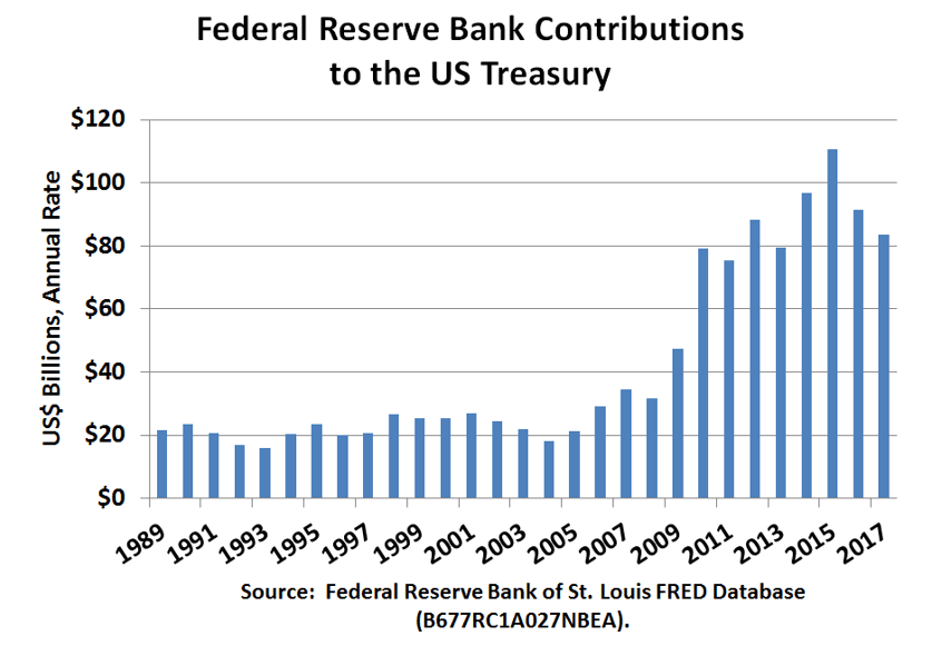 As short-term rates have been pushed higher, the Fed has increased the interest rate it pays on required and excess reserves in lock step with increases in the federal funds target range. This works to increase the Fed’s own costs of funding its balance sheet and serves as a drag on the Fed’s earnings, most of which are paid to the U.S. Treasury. Even with incrementally rising short-term rates, the Fed is in no danger of losing money. Prior to 2008, the Fed typically contributed around $20 billion or a little more to the U.S. Treasury each year. Once QE ramped-up the Fed’s balance sheet, annual contributions in the 2013-2017 period soared to the $80-$100 billion range. The Fed’s earnings are now expected to decrease modestly year-on-year as rates rise further and as the Fed shrinks its balance sheet and holds fewer assets.
