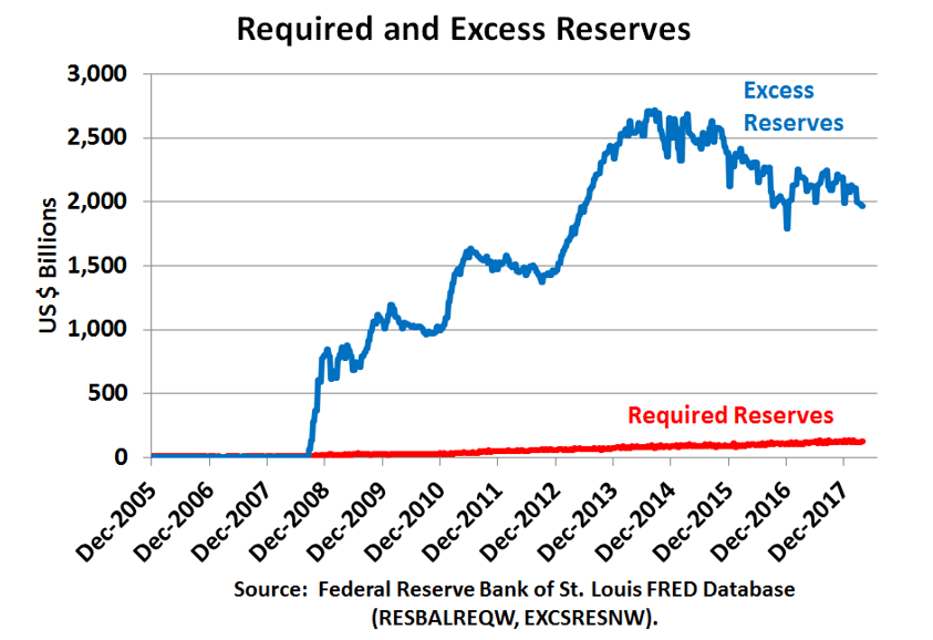 Once excess reserves ballooned after 2008, few banks needed additional funds to meet their reserve requirements. And, Fed repo transactions that added or withdrew excess reserves made little difference since the overhang of excess reserves was so large. While the Fed still does (reverse) repurchase agreements, the impact on the federal funds rate is fleeting at best. The primary means of enforcing a higher target range for the federal funds rate has been to raise the interest rate paid on reserves to the target range’s ceiling. If a depositary institution needed to borrow federal funds, it would pay a discounted interest rate or higher price for the federal funds. The result is that federal funds have tended to trade very steadily (except for the last few days of any given month) at around 7 – 13 basis points (annual rate) lower than the ceiling, which has kept the federal funds rate comfortably inside the target range. The volume of transaction, however, is generally not very high – around $75 billion a day in April 2018, for example.