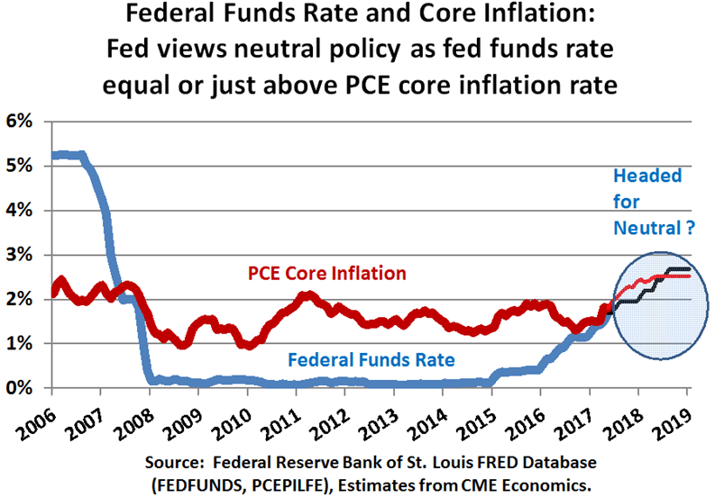 The Fed now seems on a path to steer the effective federal funds rate to a level that is equal to or just modestly higher (25 to 50 basis points) than the prevailing rate of core inflation, which we take to be the Fed’s new definition of a neutral short-term interest rate policy. Of course, the definition of a neutral policy is not universally agreed. Pre-2008, the prevailing view was that a neutral policy reflected an inflation risk premium of maybe 2% above the prevailing core inflation rate. The Janet Yellen view was that the neutral inflation risk premium was now close to zero or just incrementally positive, and that view appears to have been accepted by many FOMC members.